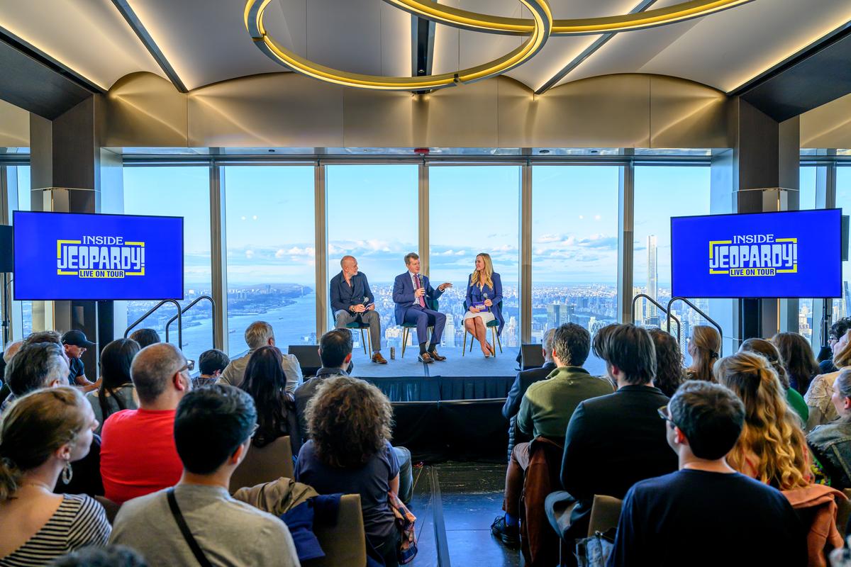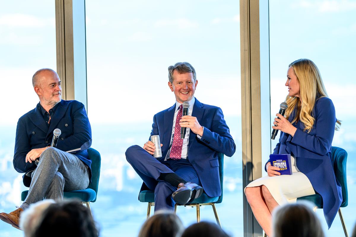 NEW YORK, NEW YORK - APRIL 12: Michael Davies, Ken Jennings and Sarah Whitcomb Foss host the Inaugural Inside JEOPARDY! live event at Edge at Hudson Yards on April 12, 2024 in New York City.