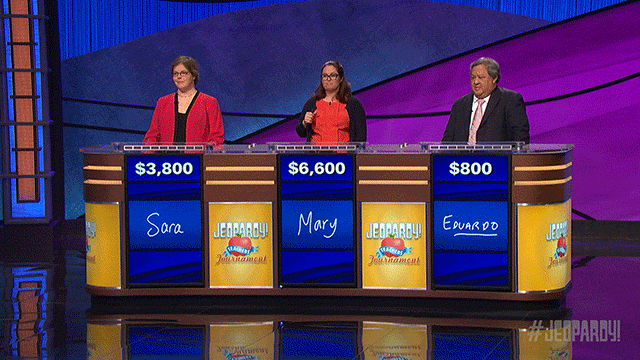Lesson: Even if you’re in a distant third place at the end of the first Jeopardy! round, there’s still time to shake it off. Eduardo Sevilla did just that, starting Double Jeopardy! at just $800 and then going on a tear to catch up. And it didn’t hurt that Eduardo grabbed a big $4,000 Daily Double in there as well. Was it enough? Well, enough to get him to the semifinals as a wild card.
